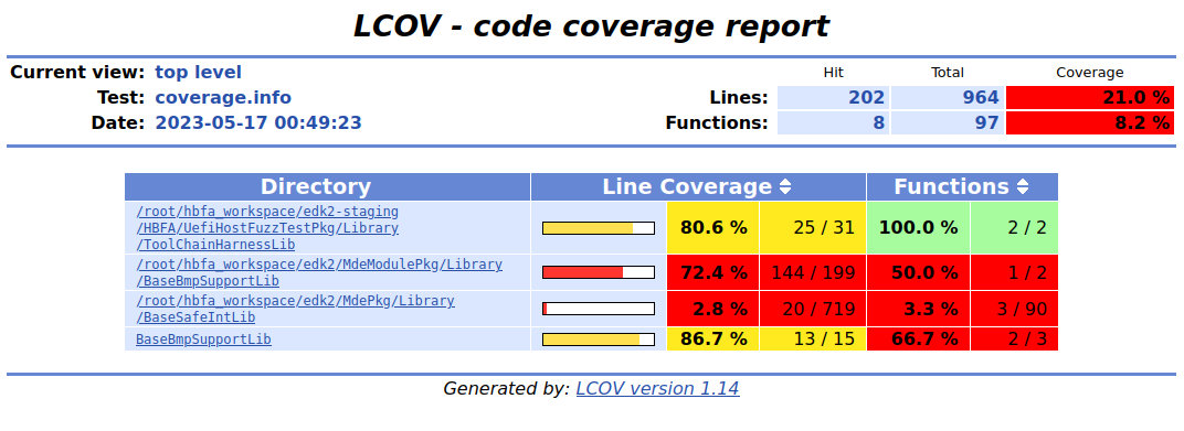 As was done when executing ‘ReportMain.py’, we’ll again specify the ‘-e’ option (MODULEBIN) as: ‘/root/hbfa_workspace/Build/UefiHostFuzzTestCasePkg/DEBUG_GCC5/X64/TestBmpSupportLib’. Importantly, the ‘-d’ option for SEEDPATH will be the ‘queue’ directory in the AFL fuzzing output ‘/tmp/fuzz_RunAFL_TestBmpSupportLib/queue’, as this will contain representative input files to reach all of the code paths discovered during the fuzzing session. Lastly, the ‘-t’ option is will not be needed (for ErrorInjection), and we’ll specify our report output directory for the ‘-r’ (REPORTPATH) argument. Putting this together and running the command: