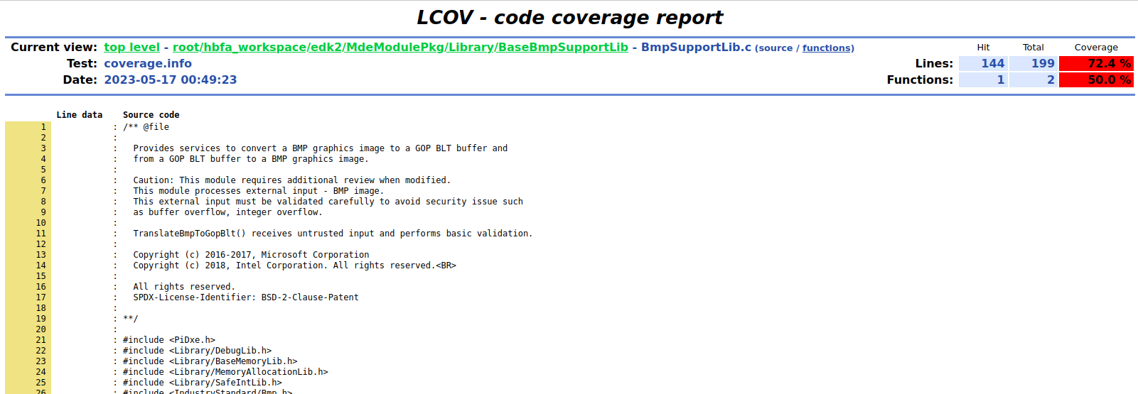 # GenCodeCoverage.py -e /root/hbfa_workspace/Build/UefiHostFuzzTestCasePkg/DEBUG_GCC5/X64/TestBmpSupportLib -d /tmp/fuzz_RunAFL_TestBmpSupportLib/queue -r /tmp/TestBmpSupportLib/