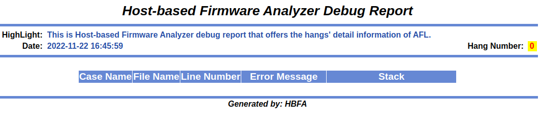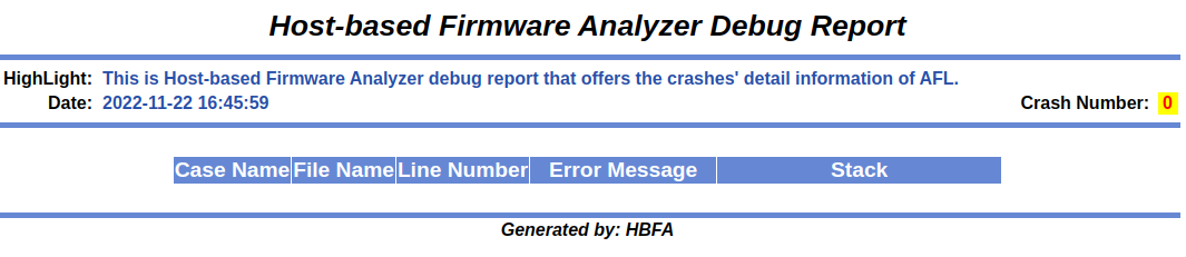 The file ‘GdbSummaryReport.html’ will contain an overview of the AFL fuzzing run (e.g. total case numbers, execution time). The file ‘IndexCrashes.html’, should contain information for detected crashes; note, if there were no crashes, then the table of cases will be empty. Example outputs for this are shown in the following.