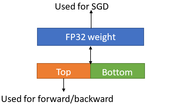 FP32 parameters are split into “Top half” and “Bottom half”. When performing forward and backward propagations, the Top halves are used to take advantage of Intel BFloat16 support. When performing parameter update with SGD, we concatenate the Top half and the Bottom half to recover the parameters back to FP32 and then perform regular SGD operations.
