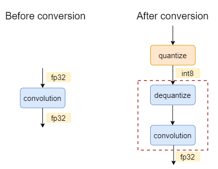 For example, for a FP32 model of one single convolution, the graph before and after conversion will be: image