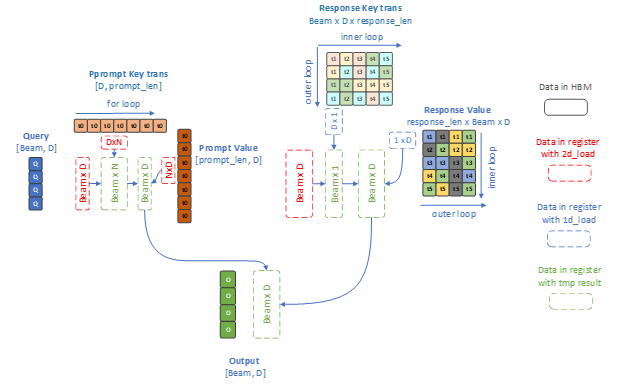 KV Cache is used to reduce computation for decoder layer but it also brings memory overheads, for example, when we use beam search, the KV Cache should be reordered according to latest beam idx and the current key/value should also be concatenated with KV Cache in the attention layer to get entire context to do scale dot product attention. When the sequence is very long, memory overheads caused by the reorder_cache and concatenate will be performance bottleneck. Moreover, in standard implementation, prompt and response key/value will be kept in contiguous KV Cache buffers for attention context computation, making it memory wasting to extend the prompt key/value with Beam Width times. Segment KV Cache is provided to reduce these overheads. Firstly, prompt key/value will be computed at Prefill phase and kept on device during the decoding phase, the shapes of which will not be influenced by the Beam Width value. At decoding phase, we firstly pre-allocate buffers (key and value use different buffers) to store the response key/value hidden states and beam index information, then use beam index history which is shown in the following left figure to decide which beam should be used by a timestamp and this information will generate an offset to access the KV Cache buffer which means that the reorder_cache and concat overheads will be eliminated by this way. The SDPA kernel based on Segment KV cache policy is shown as the following right figure.