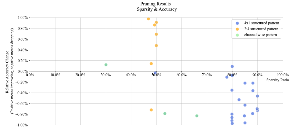 An advantage of channel pruning is that in some particular structure(feed forward parts in Transformers etc.), pruned channels can be removed permanently from original weights without influencing other dense channels. Via this process, we can decrease these weights’ size and obtain direct improvements of inference speed, without using hardware related optimization tools like Intel Extension for Transformers.