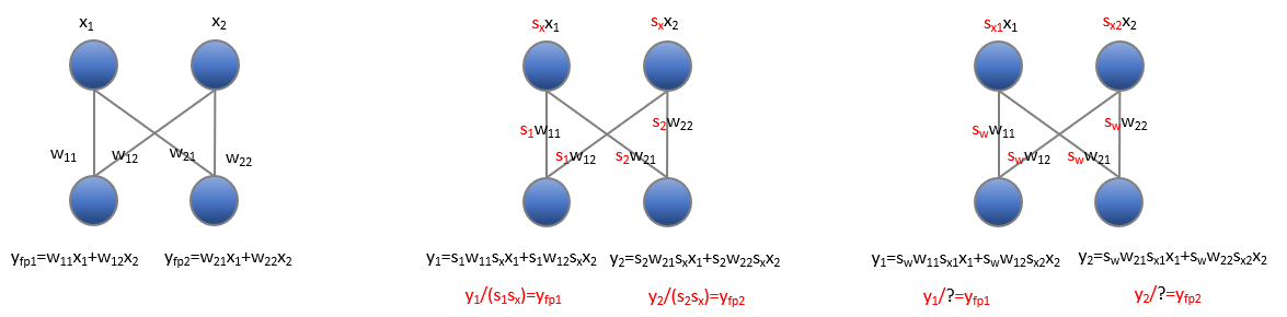 The image on the left presents a normal linear forward with 1x2 input $x$ and 2x2 weight $w$. The results $y$ could be easily obtained by simple mathematics. In the middle image, we apply per-tensor quantization for activations and per-channel quantization for weights; the results after quantization that are denoted by $y_1$ and $y_2$, could be easily dequantized to the float results $y_{fp1}$ and $y_{fp2}$ by per channel scale $1.0/s_1s_x$ and $1.0/s_2s_x$. However, after applying per-channel quantization for activation (right image), we could not dequantize the $y_1$ and $y_2$ to float results.