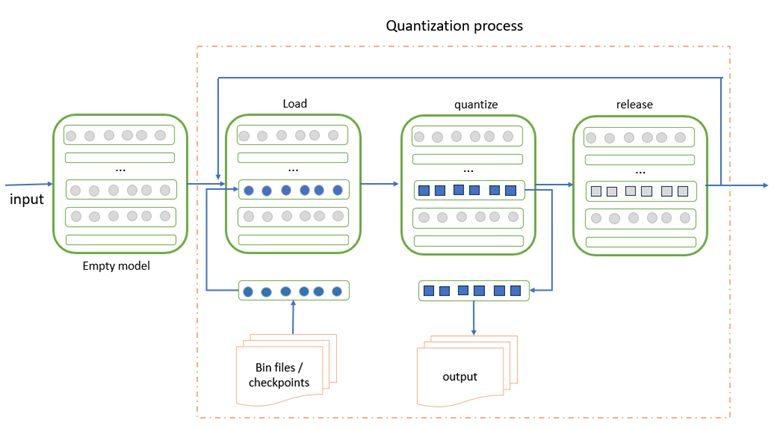 Figure 1: The process of layer-wise quantization for PyTorch model. The color grey means empty parameters and the color blue represents parameters need to be quantized. Every rectangle inside model represents one layer.