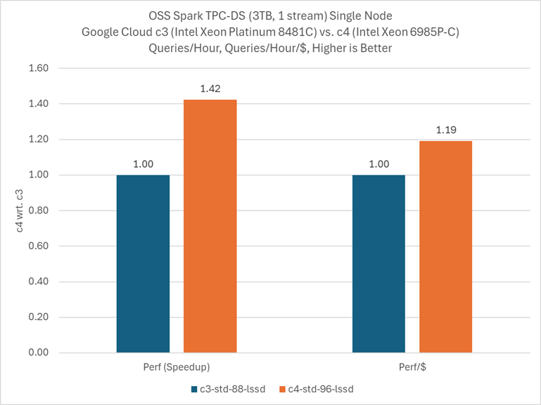 OSS Spark on GNR: 1-node, 1x Intel(R) Xeon(R) 6985P-C CPU @ 2.30GHz, 48 cores, c4-standard-96-lssd VM, HT On, Turbo Off, NUMA 2, Total Memory 360GB, BIOS Google, 1x Compute Engine Virtual Ethernet [gVNIC], 1x 375G nvme_card14, 1x 375G nvme_card1, 1x 375G nvme_card3, 1x 375G nvme_card0, 1x 375G nvme_card4, 1x 375G nvme_card8, 1x 375G nvme_card15, 1x 512G nvme_card-pd, 1x 375G nvme_card2, 1x 375G nvme_card5, 1x 375G nvme_card9, 1x 375G nvme_card11, 1x 375G nvme_card6, 1x 375G nvme_card7, 1x 375G nvme_card10, 1x 375G nvme_card12, 1x 375G nvme_card13, Ubuntu 24.04.2 LTS, 6.14.0-1012-gcp, TPC-DS Like SF3T, JDK 1.8, GCC 11, Spark 3.5.2, Hadoop 3.3.5, score=TPC-DS Like SF3T 4162 sec