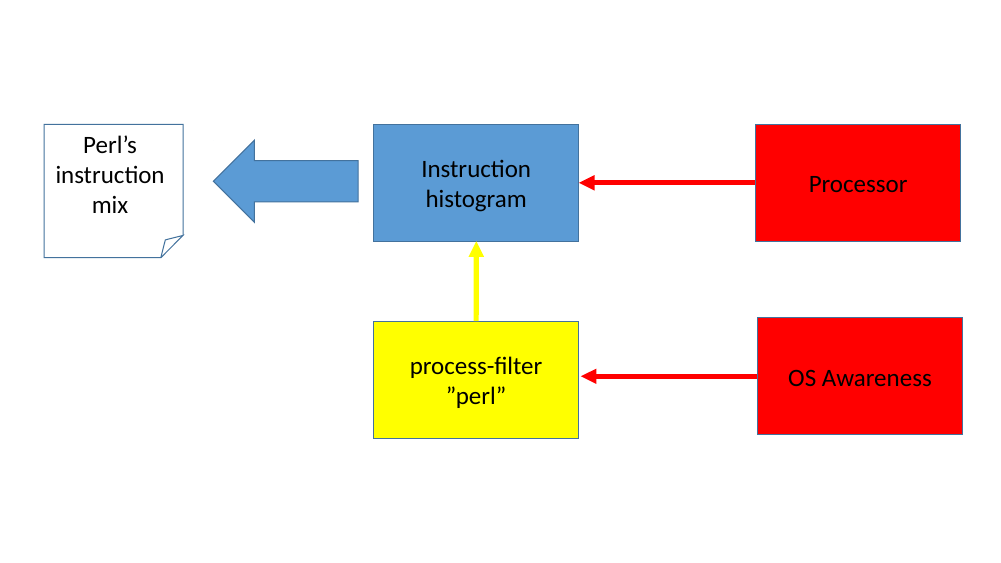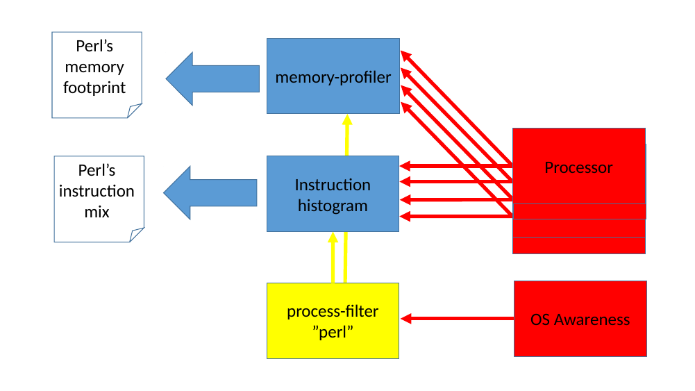 If only a specific application's instruction mix is of interest, we can add a filter to this setup. In figure 6, a process-filter has been setup to monitor the 'perl' application only. The process-filter uses the OS-Awareness feature in Simics to get information when any perl process is created, scheduled on a certain cpu, or die. With this knowledge, the process-filter enables and disables the instruction-histogram collection. The output from the instruction-histogram is now only the instruction mix for the perl application(s) that has executed.