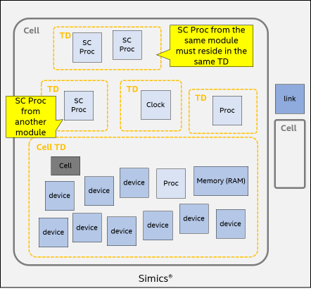 Every Simics simulation is split into a set of cells and every processor belongs to a cell. By default, all cells run in parallel with each other. SystemC related processors from different Simics modules can reside in different cells and utilize the power of running in parallel. But SystemC related processors from the same Simics module cannot and by default end up in the same cell. This limitation comes from the Accellera SystemC kernel which is not thread safe (it contains global static variables/pointers). There is an automatic check for this requirement whenever the current SystemC related cell configuration changes.