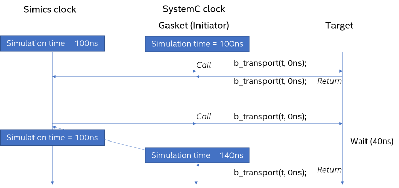 In most cases, these two clocks are synced. But the SystemC clock could run ahead of the Simics clock if needed. For example when a synchronous Simics interface calls into the SystemC device, invoking the b_transport function which in turn invokes the wait function. In this case, SystemC time must run forward in order for the b_transport to return so that the Simics interface call can return. See Figure 2.
