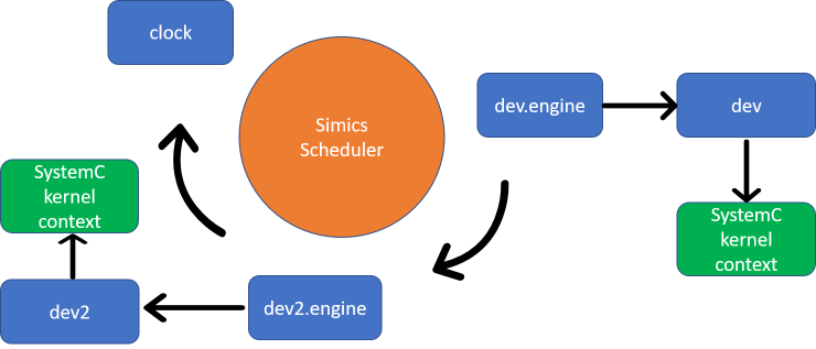 The SystemC clock (dev and dev2) is not directly scheduled by the Simics scheduler. Instead it is indirectly scheduled via the adapter’s engine object (dev.engine) which is referred to as the Simics clock. This scheduler decoupling enables the SystemC clock to be driven both by the Simics clock as well as by the adapter. As described in section 6.1, the SystemC clock drives one SystemC kernel context.